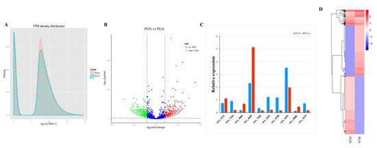 Analysis and validation of differentially expressed circRNAs between PGA and PGN. (A) CircRNAs expression amount transcript per million (TPM) density distribution map. The abscissa is the log10 (TPM+1) value of the circRNA, and the ordinate is the density corresponding to log10 (TPM+1). (B) Volcanic maps of differentially expressed circRNAs. The abscissa represents the fold change in expression of circRNAs in PGN and PGA, and the ordinate represents the statistically significant degree of change in the amount of expression of circRNAs. Blue dots indicate no significant differences in circRNAs, red dots indicate significantly up-regulated differences in circRNAs, and green dots indicate significant down-regulated differences in circRNAs. (C) Expression of 10 differentially expressed genes by RT-qPCR (p < 0.05). (D) Hierarchical clustering analysis of differentially expressed circRNAs. Red indicates high expression of circRNAs, blue indicates low expression of circRNAs.