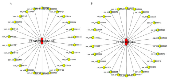 Predicting the interaction between circRNA-miRNAs. (A) Predicted circRNAs that interact with oar-miR-3955-5p. (B) Predicted circRNAs that interact with oar-miR-432.