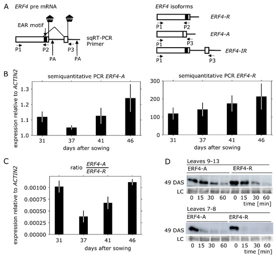 ERF4 isoform expression and protein stability. (A) Schematic illustration of ERF4 pre-mRNA with two different polyadenylation sites and primer binding sites for primer 1 (P1), primer 2 (P2) and primer 3 (P3), which were used for semi-quantitative reverse transcriptase PCR (sqRT-PCR) as described in [27]. Boxes denote exons, lines denote introns and untranslated regions, PA indicates alternative polyadenylation sites, black box indicates the repressing ERF-associated amphiphilic repression (EAR) motif. cDNA of the ERF4 isoforms is shown on the right side. (B) Results of the sqRT-PCR using RNA isolated from Col-0 plants at different developmental stages indicated in days after sowing (DAS). Graph shows expression of ERF4-A (36 cycles, 3 μL cDNA) and ERF4-R (27 cycles, 2 μL cDNA), which was quantified using ImageJ and is presented relative to expression of ACTIN2. Error bars indicate ±SE, n = 3. (C) Ratio of ERF4-A to ERF4-R mRNA at different developmental stages (D) Cell-free protein degradation assay. 6xHIS-tagged ERF4-R (26.6 kDa) and ERF4-A (24.5 kDa) proteins were incubated in protein extract of young (No. 9−13) and middle old leaves (No. 7 and 8) for 0−60 min. Five plants were pooled for protein extraction and were harvested 49 days after sowing (DAS). Amido black staining of the upper part of the polyvinylidene difluoride (PVDF) membrane is shown as loading control (LC).