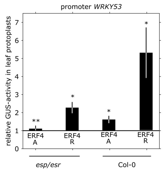 Impact of ERF4 on WRKY53 expression. Transient expression assays were performed in Arabidopsis protoplasts with a 2.8 kbp fragment of the WKRY53 promoter that drives expression of GUS in Col-0 and esp/esr mutant leaf protoplasts. Values represent fold-change of GUS-activity relative to the empty vector after normalization to luciferase activity from a minimum of four experiments. Error bars indicate ±SE. Statistical differences were determined by one sample t-test (* p ≤ 0.05, ** p ≤ 0.005, *** p ≤ 0.0005).