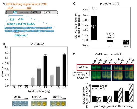 In a yeast-one-hybid (Y1H) screen, which was performed to find potential regulatory proteins that interact with the CAT3 promoter, different CAT3 promoter fragments were cloned in front of reporter genes (His and Ade, LacZ) and brought into yeast cells together with a cDNA library obtained from 7-week-old Arabidopsis leaves. cDNA insertions were sequenced and identified from yeast cells growing on selection media. Among others, partial sequences of ERF4 were identified in two independent clones to bind to a 150-bp fragment (−332 to −182) of the CAT3 promoter (Figure 5A). Therefore, the full-length coding sequence of ERF4-R, which is the predominantly expressed isoform, was cloned into the pGADT7 vector and transformed into the reporter yeast strain Y187 [pHISi-CAT3] and growth on selection media could be confirmed. Therefore, the full-length ERF4-R protein binds to a cis-element in the CAT3 promoter. The DNA-binding of ERF4 to the CAT3 promoter was further analyzed in vitro by DPI-ELISA. For DPI-ELISA, the coding sequence of both ERF4-R and ERF4-A isoforms were cloned in pETG10A with N-terminal hexa-histidine-tag (6xHIS-tag) and expressed in bacteria. A 55-bp biotinylated DNA fragment of the CAT3 promoter sequence, which was identified in the yeast-one-hybrid screen and contains the DRE motif CAGCC, an already known binding motif for ERF4 [41], was used (Figure 5A). Whereas the crude lysate of the Escherichia coli (E. coli) strain expressing the empty vector did not show any binding activity, both ERF4 isoforms were able to bind to this fragment (Figure 5B).