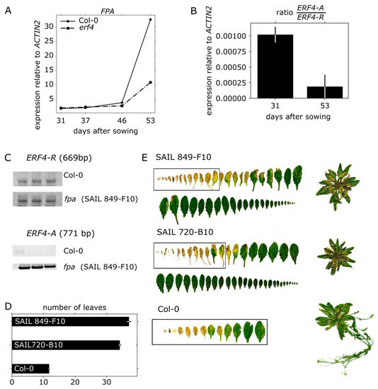 Characterization of fpa plants. (A) qRT-PCR data shows expression level of FPA in Col-0 and erf4 plants relative to ACTIN2. Leaves No. 7 of 5 biological replicates were pooled. Data are means of two technical replicates. (B) Ratio between ERF4-A and ERF4-R mRNAs at early (31 DAS) and late stages of development (51 DAS) (C) Semi-quantitative-PCR (sqRT-PCR) with RNA isolated from a pool of 10 plants was performed. Images show representative bands on a 1% agarose gel for ERF4-R (27 cycles, 2 μL cDNA, 669 bp) and ERF4-A (36 cycles, 3 μL cDNA, 771 bp) in Col-0 and fpa (SAIL 849-F10) plants of three technical replicates. (D) Number of rosette leaves 6 weeks (42 DAS) after sowing of fpa and Col-0 plants. Error bars indicate ±SE, n = 10. (E) Representative pictures of rosette leaves sorted according to their age 7.5 weeks (51 DAS) after sowing of two fpa lines (SAIL 849-F10 and SAIL 720-B10) and Col-0.