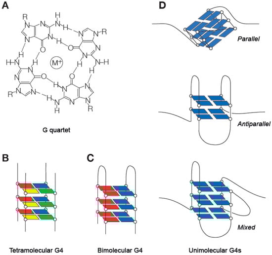 G quartets and G quadruplexes. (A) A G quartet. Four G bases form a planar tetrad stabilised by Hoogsteen bonding and a central monovalent metal ion. (B–D) Basic forms of the G quadruplex. (B) A tetramolecular G4. (C) A bimolecular G4. (D) Three conformations of unimolecular G4 with different backbone arrangements, parallel, anti-parallel and mixed.