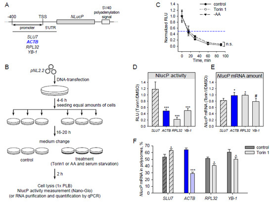 The 5’end is important for mTOR-dependent translation. Therefore, we used a reporter system with the promoter and 5’UTR (Figure 1A) to ensure that reporter mRNAs receive 5’ ends similar to those of native RNAs. As a reporter gene, instead of traditionally used firefly luciferase (half-life time ~3 h [38]), we used the short-living Nano luciferase, NLucP (half-life time ~15 min, Figure 1C). This allowed measuring differences in protein synthesis resulting from short-term treatments. The scheme of the experimental workflow is shown in Figure 1B. For promoter regions we took −400 bp regions upstream of the CAGE (cap analysis gene expression) peak maxima (HEK293 data, [32]) and the respective full-length 5’ UTRs for the following genes: RPL32 and YB-1 (mTOR translational targets), ACTB, and SLU7 (pre-mRNA splicing factor, negative control, translation of SLU7 mRNA does not change upon mTOR inhibition according to Ribo-Seq data [10,11]).