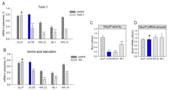 Translation of endogenous β-actin mRNA decreases under amino acid starvation and mTOR inhibition. (A–B) HEK293T cells were treated for 2h with DMSO (control), 500 nM Torin1 (A), or subjected to amino acid and serum starvation (B). The cells were lysed, fractionated at a sucrose gradient of 15–45%, and mRNA abundance of endogenous SLU7, ACTB, RPL32, RPL14 and YB-1 in polysome- and subpolysome fractions was measured by qPCR. A polysome fraction was estimated as (mRNA in polysome)/(mRNA in polysome + mRNA in subpolysome). (C–D) HEK293T cells were transfected with pNL2.2; after 2h of amino acid and serum starvation (-AA) the cells were collected, and luciferase activity (C) and NlucP mRNA abundance (D) were measured. Student’s t-test was used to estimate the statistical significance versus control treatment (A–B) or versus the SLU7 control (C–D), *** p < 0.001; *p < 0.05; #—nonsignificant.