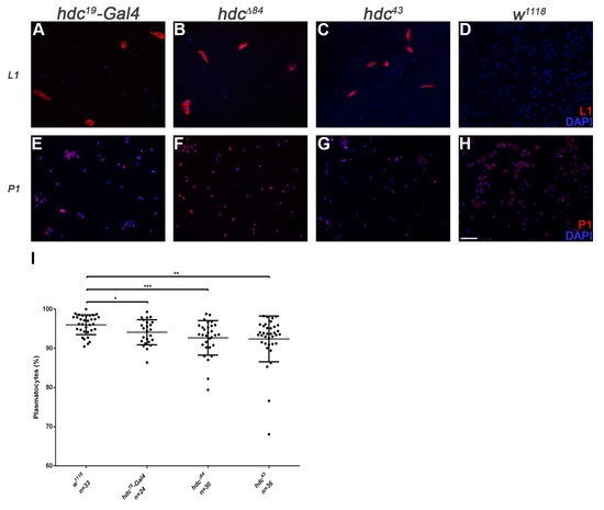 Figure 2. Circulating hemocytes of the hdc mutant larvae. (AD) Lamellocytes were present in the circulation of hdc19-Gal4 (2.61% (n = 42)) (A), hdc∆84 (2.15% (n = 24)) (B) and hdc43 (6.07% (n = 52)) (C) homozygous mutant larvae. Lamellocytes were rarely observed in control w1118 larvae (0.07% (n = 24)) (D). Lamellocytes were stained with L1 antibody (red); (EH) Reduced plasmatocyte ratio was observed in hdc19-Gal4 (E), hdcΔ84 (F), and hdc43 (G) homozygous mutant larvae compared to control w1118 (H). Plasmatocytes were stained with P1 antibody (red). Nuclei were stained with DAPI (blue). Hemocytes were visualized on a Zeiss Axioskope 2MOT epifluorescent microscope, original magnification ×10 and processed with ImageJ and Adobe Photoshop CS2 softwares. Scale bar: 20 μm. (I) Quantification of plasmatocytes in the hdc mutant larvae. Error bars represent the standard deviation of the mean. ***: p < 0.001; **: p < 0.01; *: p < 0.05. Significance was determined by unpaired Student’s t-test.