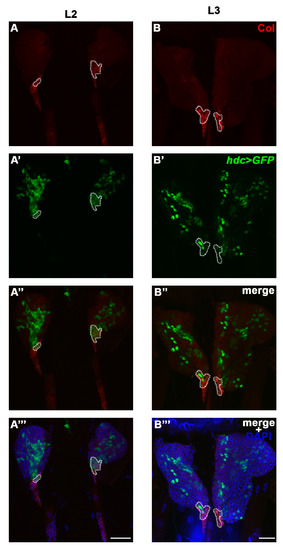 To locate the focus of the hdc mutation in relation to its hematopoietic phenotype, first we analyzed the hdc19-Gal4>GFP expression in the lymph gland at different larval stages. In L2 larvae, hdc19-Gal4>GFP was broadly expressed in the primary lobes of the lymph gland. The expression pattern partially overlapped with the anti-Collier staining in the PSC and in the secondary lymph gland lobes (Figure 4A–A’’’ and Figure A1A–A’’). In early L3 larvae, the expression pattern was greatly altered as compared to the L2 stage, the hdc19-Gal4>GFP being expressed in less hemocytes of the primary lobes, and only in a few of the cells in the PSC (Figure 4B–B’’’ and Figure A1B–B’’). In wandering L3 larvae, the number of GFP expressing hemocytes was further reduced in the primary lobes, and no GFP expression was detected in the PSC. However, hdc19-Gal4>GFP was still detectable in a subset of the cells in the secondary lymph gland lobes (Figure A1C–C’’).