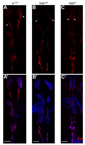 Figure 6. Integrity of the lymph gland and the PSC in hdc mutants. (A,A’) Anti-Collier staining (red) of the lymph gland of the w1118 control larva; (BC’) Anti-Collier staining (red) of the lymph gland of the hdcΔ84 (B,B’) and hdc43 (C,C’) mutant larvae. The size and morphology of the lymph gland and the PSC in the hdc mutants did not differ from the control. Nuclei were stained with DAPI (blue) (A’,B’,C’). Arrows point to the PSC of the lymph gland. Images were taken with Leica TCS SP5 Confocal Microscope, original magnification ×20, and processed with LAS AF Lite (Leica Microsystems CMS GmbH), ImageJ and Adobe Photoshop CS2 softwares. Scale bars: 50 μm.