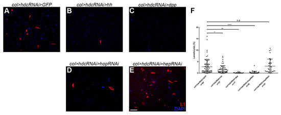 Figure 7. The interaction of Hdc with the signal transduction pathways of the lymph gland. (A) Silencing of hdc with the Pcol85-Gal4 driver in the PSC of the lymph gland resulted in differentiation of lamellocytes in naive larvae (Pcol85-Gal4, UAS-hdcRNAi/+; UAS-2xEGFP/+); (BE) Overexpression of hh (B) and dpp (C) with the col-Gal4 driver significantly reduced the proportion of lamellocytes (red) in the circulation of hdc-silenced larvae (Pcol85-Gal4, UAS-hdcRNAi/UAS-hh(M4), Pcol85-Gal4, UAS-hdcRNAi/UAS-dpp, respectively). Silencing of hop with RNA interference (Pcol85-Gal4, UAS-hdcRNAi/UAS-hopRNAi) (D) also resulted in the rescue of the hdc phenotype, while silencing of hep (Pcol85-Gal4, UAS-hdcRNAi/UAS-hepRNAi) (E) did not affect the phenotype significantly. Nuclei were stained with DAPI (blue). Hemocytes were visualized on a Zeiss Axioskope 2MOT epifluorescent microscope, original magnification ×10 and processed with ImageJ and Adobe Photoshop CS2 softwares. Scale bar: 20 μm. (F) Quantification of lamellocyte numbers in the hdc-silenced and the rescued larvae. Error bars represent the standard deviation of the mean. **: p < 0.01; *: p < 0.05; ns: non-significant. Significance was determined by unpaired Student’s t-test using GraphPad Prism 6.