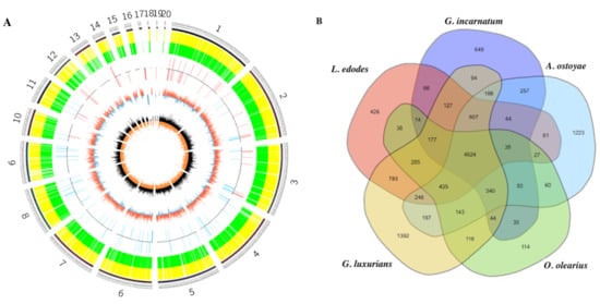The Gloeostereum incarnatum genome and comparative genomics analysis. (A) The G. incarnatum genome. Outside to inside of concentric circles show assembly scaffold number, gene density, non-coding RNA (ncRNA), GC count and GC skew. (B) Unique and homologous gene families. The number of unique and shared gene families is shown in each of the diagram components and the total number of gene families for each fungus is given in parentheses.