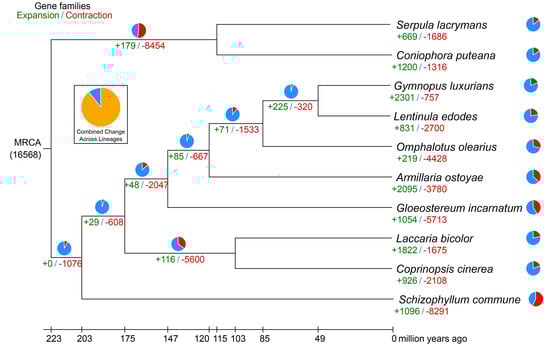 The Gloeostereum incarnatum genome evolutionary analysis. The number of expanded (green) and contracted (red) gene families is shown at each branch. The estimated divergence time (MYA: million years ago) is shown at the bottom. MRCA: most recent common ancestor.