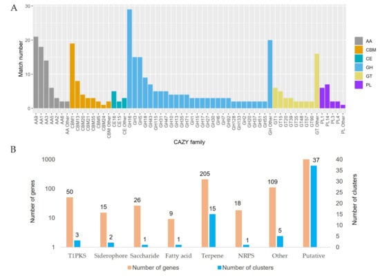 (A) Annotation of carbohydrate-related genes in the G. incarnatum genome; (B) secondary metabolite-related gene clusters in the G. incarnatum genome. T1PK: Type I polyketide synthases; NRPS: nonribosomal peptide synthetase.
