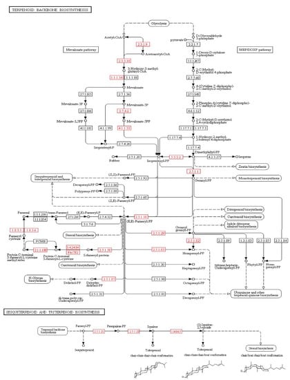 “Terpenoid backbone biosynthesis” (KEGG: ko00900) and “sesquiterpenoid and triterpenoid biosynthesis” (KEGG: ko00909) pathways of G. incarnatum. Red boxes indicate the presence of the enzymes, whereas white boxes indicate enzyme is not present.
