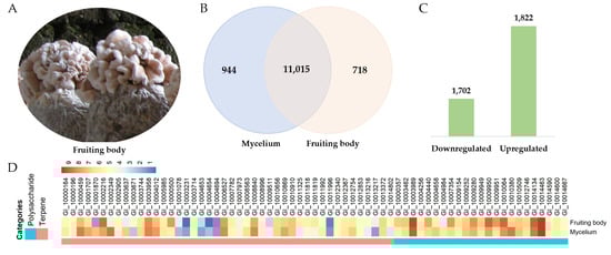 Comparative transcriptome profiling of the mycelium and the fruiting body of G. incarnatum: (A) Fruiting bodies of G. incarnatum; (B) Venn diagram of the genes expressed in the mycelium and/or the fruiting body; (C) number of genes being significantly downregulated or upregulated in the fruiting body compared with the mycelium; (D) heatmap of the genes associated with the biosynthesis of polysaccharides and terpenes.