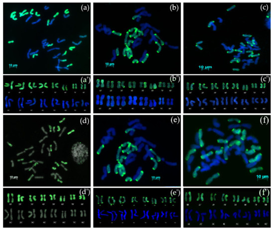 Genomic in situ hybridization (GISH) on mitotic metaphase chromosomes of advanced generations from interspecific hybrids between A. cepa and A. fistulosum. (a) AVON 1275 (S5), 2n = 4x = 32, with 16 chromosomes of A. cepa and 16 chromosomes of A. fistulosum; (b) AVON 1278 (BC1), 2n = 4x = 32, with 16 chromosomes of A. cepa and 16 chromosomes of A. fistulosum; (c) AVON 1282 (S4BC1) 2n = 4x = 32, with 16 chromosomes of A. cepa and 16 chromosomes of A. fistulosum; (d) AVON 1290 (S4BC1), 2n = 4x = 32, with 16 chromosomes of A. cepa and 16 chromosomes of A. fistulosum; (e) AVON 1501 (S4BC1), 2n = 4x = 32, with 16 chromosomes of A. cepa and 16 chromosomes of A. fistulosum; (f) AVON 1502 (S4BC1), 2n = 4x = 32, with 16 chromosomes of A. cepa and 16 chromosomes of A. fistulosum; (a’, b’, c’, d’, e’, f’) karyotypes of the AVON1275, AVON121278, AVON 1282, AVON 1290, AVON 1501, and AVON1502 hybrids, respectively. Digoxigenin labelled probe DNA of A. fistulosum and detected with FITC (green fluorescence).