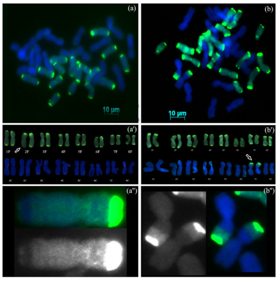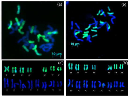 GISH on mitotic metaphase chromosomes of advanced generations from interspecific hybrids between A. cepa and A. fistulosum: (a) AVON 1283 (S4BC1) contains 16 chromosomes of A. cepa and 14 chromosomes of A. fistulosum; (b) AVON 1284 (S3BC1) contains 16 chromosomes of A. cepa and 14 chromosomes of A. fistulosum; (a’,b’) karyotypes of the AVON 1283 and AVON 1284 hybrids, respectively, with missing one pair of homologous chromosomes 5 of A. fistulosum.