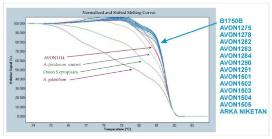 Cytoplasms of plants from advanced generations from interspecific hybrids were determined using high-resolution melting (HRM) of an indel in the chloroplast accD gene [20]. This marker distinguishes normal (N) male−fertile cytoplasm from male−sterile (S) cytoplasm of onion, as well as the cytoplasms of A. fistulosum and A. galanthum (Figure 4). None of the accessions originating from the original interspecific cross possessed the cytoplasm of A. fistulosum. Most interspecific hybrids between A. cepa and A. fistulosum have been produced using A. fistulosum as the female parent, which limits introgression due to deleterious nucleo-cytoplasmic interactions [22]. In theory, chromosome regions carrying disease or pest resistance(s) in these accessions should avoid this deleterious interaction because they possess N cytoplasm of A. cepa.