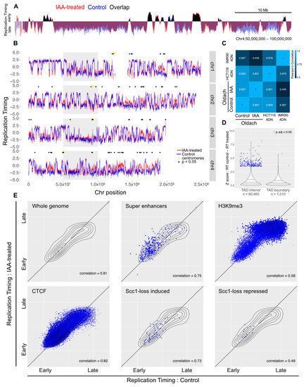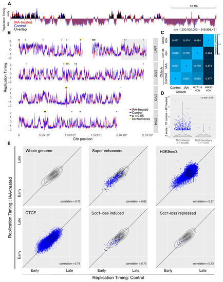 The following are available online at https://www.mdpi.com/2073-4425/10/3/196/s1, Supplemental Figure S1. Newly generated RepliSeq data agrees with previously published RepliSeq data for HCT116 cells; Supplemental Figure S2. Sample preparation for asynchronous RepliSeq experiment; Supplemental Figure S3. Auxin treatment post release from nocodazole by mitotic shake-off does not perturb synchronous progression through S phase; Supplemental Figure S4. Sample preparation for synchronous RepliSeq experiment; Supplemental Figure S5. Additional plots of control versus auxin-treated replication timing at genomic loci with chromatin states or protein binding sites associated with characteristically early or late replication timing; Supplemental Figure S6. Loci with significant changes to replication timing, in asynchronous, synchronized, or both experiments; Supplemental Table S1. Source for genomic features annotated in HCT116 cells.