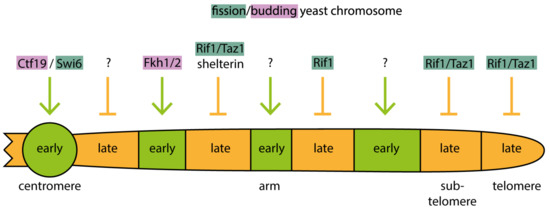 It has emerged in recent years that yeast cells utilize distinct molecular pathways to control origin firing timing of different genome regions. There is even more than one pathway to control the firing of separate groups of early and late origins, respectively. For example, both pericentromeric heterochromatin and a large proportion of the transcribed euchromatin replicate early. Yet pericentromeric origins require the kinetochore protein Ctf19 for early firing whereas many euchromatic origins rely on forkhead transcription factors [38,111]. Different late origins require Rif1 and/or Taz1 and/or shelterin for late firing, depending on whether they are in chromosome arms, subtelomeres or telomeres [112,113,114]. These pathways are discussed in detail below.