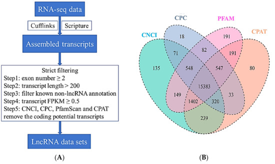 Identification of long non-coding RNAs (lncRNAs) in skin transcriptome. (A) Workflow for lncRNA identification. (B) Candidate lncRNAs were identified by using four applications: CNCI (coding-non-coding-index), CPC (coding potential calculator), PFAM-scan v1.3 and CPAT (coding potential assessment tool) which detect and remove putative protein-coding transcripts.