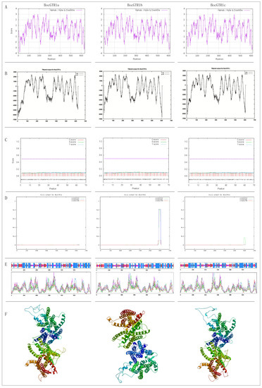 Bioinformatics analysis of the deduced amino acids of three BocGTR1s. (A) Prediction of hydrophobicity of BocGTR1s protein using ProtScale server. (B) Prediction of the trans-membrane structure of the BocGTR1s protein using TMpred server. (C) Prediction of the BocGTR1s protein signal peptide using SignalP server. (D) Prediction of the BocGTR1s protein crimp helix using COILS server. (E) Prediction of the two-dimensional structure of BocGTR1s using SOPMA server. (F) Prediction of the three-dimensional structure of BocGTR1s using the SWISS-MODEL server.