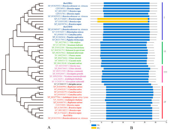 Phylogenetic tree and conserved domain of BocGTR1s with 41 GTR homology proteins from plants. (A) This phylogenetic tree was constructed by the neighbor-joining method. Numbers on the tree represent confidence values from the bootstrap test for 1000 replicates. (B) The conserved domain of BocGTR1s with 41 GTR homology proteins from plants.