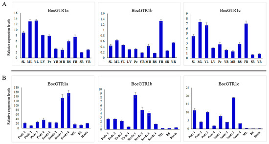 Quantitative real-time RT-PCR was carried out using a SYBR Green I Mix (TaKaRa, Dalian, China) as previously described [35]. Gene-specific and β-actin-specific primers were designed for the three BocGTR1s and β-actin (Supplementary Table S1). Triplicate technical replicates in quantitative PCR experiments were performed for each sample, and the expression values obtained were normalized against β-actin. Analysis of the relative gene expression data was conducted using the 2−∆∆Ct method [37].
