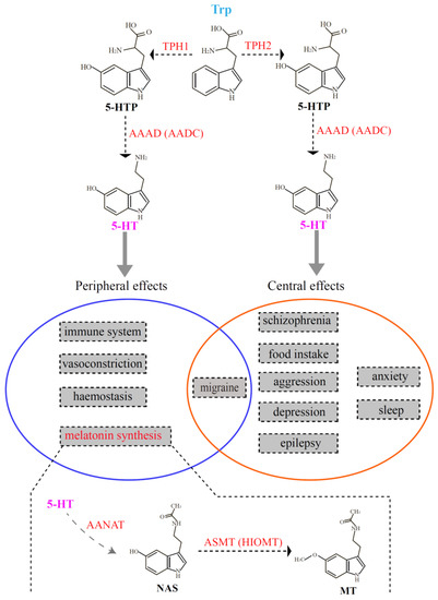 As one of the major monoaminergic neurotransmitters in the central nervous system, serotonin is involved in various physiological processes, such as the regulation of appetite, aggressiveness, body temperature, fear, mood, pain, reproduction, sleep, and vascular functions [1,2]. Before it becomes a neurotransmitter, serotonin also influences the development and maturation of the mammalian brain [3]. In addition, serotonin acts as a precursor for the synthesis of melatonin, which is mainly produced in the pineal gland of vertebrates. Tryptophan hydroxylase (TPH, EC 1.14.16.4) is the rate-limiting enzyme for serotonin biosynthesis and is the initial activated enzyme in melatonin synthesis. TPH transforms tryptophan (Trp) into 5-hydroxytryptophan (5-HTP) [4], and subsequently, 5-HTP is catalyzed to serotonin (5-hydroxytryptamine, 5-HT) by l-aromatic amino acid decarboxylase (AAAD, EC 4.1.1.28) [5]. Serotonin is further catalyzed by aralkylamine N-acetyltransferase (AANAT, EC 2.3.1.87) [6] and acetylserotonin-O-methyltransferase (ASMT; EC 2.1.1.4) [7] to finally generate melatonin (MT; see Figure 1).