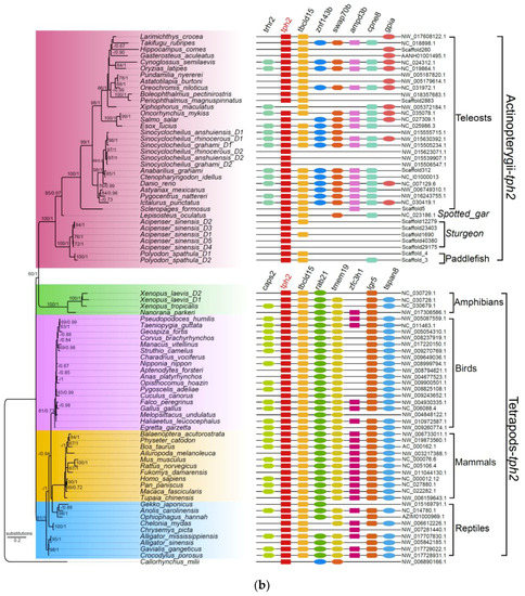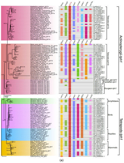 Based on these results, we determined that both tph1 and tph2 were divided into two main clades, one for tetrapods and another for Actinopterygii. We detected in tetrapods and some basal non-teleost ray-finned fishes, namely, the spotted gar, American paddlefish, and Chinese sturgeon, only one isform of tph1. Notably, tph1, in the majority of teleosts that had undergone TSGD, could be further divided into tph1a and tph1b (see more details in the left part of Figure 2a).