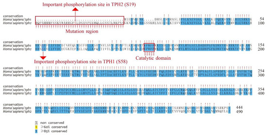 We first aligned the protein sequences of human tph1 and tph2, which were located on chromosomes 11 and 12, respectively. Depending on the alignment results, we observed that TPH1 and TPH2 were highly conserved in humans, while TPH2 has an extra length of 41 aa at the NH2-terminal (Figure 3). Ser 19 in TPH2 and Ser 58 in TPH1 have been reported as two of the most important phosphorylation sites [13,41]. The TPH enzymes are activated through phosphorylation, and then the phosphorylated TPHs bind to 14-3-3 proteins (a family of acidic, highly homogenous proteins) to increase the stability of these enzymes against degradation [42]. Thus, the absent region in TPH1 in comparison to TPH2 may imply functional divergence despite the existence of other conserved sequence features. The phosphorylation site of Ser 58 in TPH1 was also conserved in TPH2, while TPH2 had an additional phosphorylation site at Ser 19, which may suggest that TPH2 would be more stable and have stronger inhibition of dephosphorylation compared with TPH1. Both TPH1 and TPH2 have a conserved pentapeptide (Val–Pro–Trp–Phe–Pro) catalytic domain that begins at the residue 151 of human TPH2 (see Figure 3).