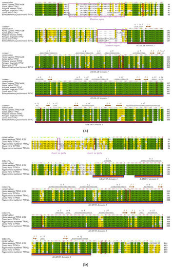 As mentioned above, most teleosts that had undergone TSGD had two isotypes of tph1 named tph1a and tph1b. To further detect the differences between tph1a and tph1b, we selected two representative species from the teleosts to perform the alignment with the human TPH1 (protein ID: 5L01) as the template. TPH1a contains 483 aa, while TPH1b contains 480 aa. TPH1a has two aa (LG or IG) inserted at sites 20 and 21 and one aa of N inserted at site 47 compared to TPH1b. These three insertion sites in TPH1a are marked with rose boxes in Figure 4b. Many variable sites between TPH1a and TPH1b were also identified near the first α-helix. However, the phosphorylation sites (marked within red boxes) are almost identical between TPH1a and TPH1b. In general, the domain regions were highly conserved between TPH1a and TPH1b in teleosts (Figure 4b). Alignment and secondary structures of TPH1a and TPH1b in additional teleost species are presented in Figure S2.