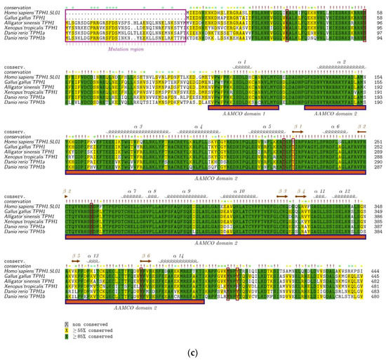 Similarly, alignment of TPH1 proteins in five representative species of vertebrates is shown in Figure 4c. The alignment indicated that fishes, amphibians, and reptiles had about 39 more aa compared with mammals and birds at the NH2-terminal. Eight phosphorylation sites (K33, S58, T205, S228, S260, Y373, Y401, and Y404 in TPH1) are marked with red boxes in Figure 4c. Among these phosphorylation sites, only S288 in humans was changed to T228 in other tetrapods and fishes, and Y404 in human was changed to F404 in amphibians. Generally, TPH1 contains two aromatic amino acid monoxygenases, catalytic and oligomerization (AAMCO) domains, and the secondary structures of TPH1 consist of 14 α-helices and six β-strands (see Figure 4c). Alignment and secondary structures of TPH1 in additional teleost species are shown in Figure S2.