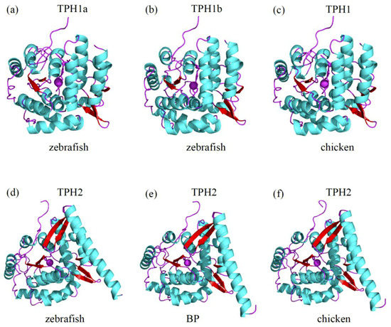Predicted 3D structures of representative TPH proteins. Comparisons of the 3D structures of zebrafish TPH1a (a), zebrafish TPH1b (b), chicken TPH1 (c), zebrafish TPH2 (d), BP TPH2 (e), and chicken TPH2 (f) are illuminated in Section 3.5. Helices of the catalytic domains and β-strands are colored sky blue and red, respectively. Loop regions are marked in purple.