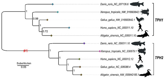 The Bayesian inference (BI) tree based on five TPH1 and TPH2 proteins selected from those shown in Figure S1 to represent the five major groups of vertebrates for selection pressure analysis. #1 denotes the foreground of the TPH2 clade. Numbers in the topology indicate the Bayesian posterior probabilities. The diamonds at the tips of each branch are colored based on the branch length, with a darker color representing a shorter evolutionary branch.