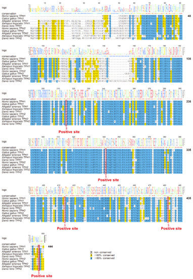 We also added ten additional vertebrate sequences, with five belonging to TPH1 and five belonging to TPH2 (see Figure S3) to form a more comprehensive dataset to confirm the analysis of positive selection. The results also supported the hypothesis that the branch of TPH2 possibly experienced positive selection in comparison to TPH1 (the log-likelihood values under one-ratio and two-ratio models were ln L = −11719.144671 and ln L = −11713.763977, respectively, and the p-value from the χ2 test was less than 0.001). We performed the analysis again under branch site models and determined that the list of inferred positively selected sites was the same as in the previous version.