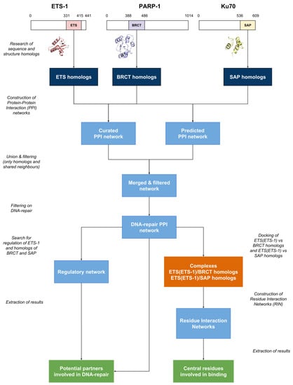 Because Ets-1 can interact with two different domains of two different DNA repair proteins, namely the BRCT domain of PARP-1 and the SAP domain of Ku70 (also called XRCC6), through its ETS domain, we hypothesized that ETS(Ets-1) could also interact with homologous BRCT or SAP domains. Following the workflow depicted in Figure 1, we first identified proteins that contain at least one domain homologous to ETS(Ets-1), BRCT(PARP-1) or SAP(Ku70). In order to then identify which of these are good candidates, we first retrieved experimentally verified interactions between them and then extended the set to predicted interactions of Ets-1, PARP-1 or Ku70. We focused on proteins involved in DNA repair and also considered predicted regulations in order to evaluate a potential interoperability between Ets-1 and a partner. In this regulatory network, we integrated expression data, comparing cancerous cells with high Ets-1 expression levels to cancerous cells with low Ets-1 expression levels, and thus, evaluate the effect of Ets-1 on the expression of potential partners. Finally, we performed protein-protein docking between ETS(Ets-1) and identified BRCT and SAP homologs. These were followed by Residue Interaction Networks analyses to compare the predicted binding modes to the established ones for ETS(Ets-1)/BRCT(PARP-1) and ETS(Ets-1)/SAP(Ku70) [].