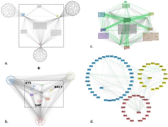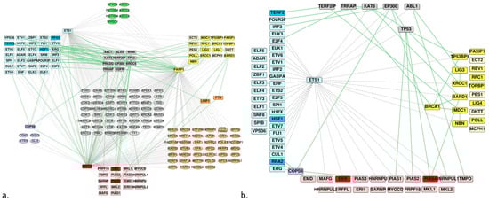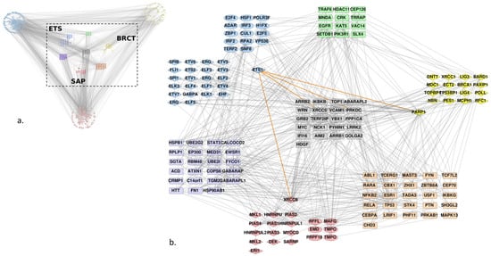 Considering the predicted and experimentally determined interactions between the homologs of ETS and those of BRCT or SAP, we hypothesized that some of the last two groups could constitute potential partners of the Ets-1 protein, especially those involved in DNA repair mechanisms, seeing that Ets-1 also interacts with PARP-1 and DNA-PK. Focusing on the merged PPI network of the homologs and common partners (Figure 3c), we annotated and filtered the network according to their association to DNA repair activities with the ClueGO app for Cytoscape. We obtained the PPI network depicted in Figure 4a, where we kept all the proteins of the three homologs groups. We filtered the network to conserve (i) the proteins of the three groups of homologs, (ii) the proteins that are not involved in DNA repair but that make bridges between the proteins of the group of the ETS homologs and the proteins of the group of the SAP or BRCT homologs involved in DNA repair and (iii) the proteins of the SAP or BRCT group that are not annotated as belonging to DNA repair mechanisms but that are connected to a protein that is involved in DNA repair and makes a bridge with the ETS group. Because the interactions Ets-1/PARP-1 and Ets-1/Ku70 are already known, we removed them from the network (Figure 4b).