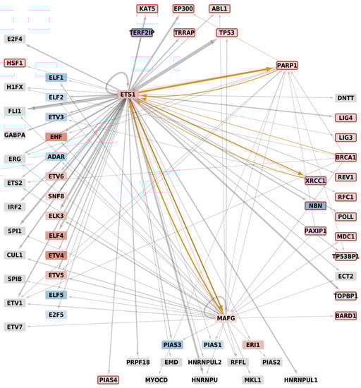 Metatargetome of Ets-1, PARP-1, BRCA1, PAXIP1, XRCC1 and MAFG filtered on the proteins of the network of Figure 4b. Differential expression data between MDA-MB-231 and MCF-7 cells were mapped onto the network; only signals with adjusted p-value ≤ 0.01 were kept; nodes are colored as a gradient of the log2 fold-change from blue (log2(Fold Change) ≤ −2) to white (log2(FC) = 0) and red (log2(FC) ≥ 2); grey nodes do not show significantly different signals; the width of arrows relates to the number of occurrences in databases found by iRegulon, the larger, the higher number; on the left stand the ETS homologs, at the bottom the SAP homologs, on the right the BRCT homologs and top shows the other proteins of the Figure 4b; proteins that are associated to DNA-repair have a red border; orange arrows are those that involve a regulation by Ets-1, eventually reciprocal.