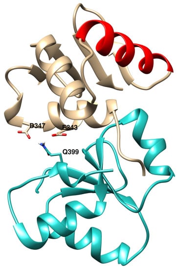 First model of the docking of the ETS domain of Ets-1 (top) and the first BRCT domain of XRCC1 (bottom). At the interface, the Q399 variant of XRCC1 is depicted in stick as well as the two negatively charged amino acids D347 and E343 of ETS. The DNA-binding helix H3 of ETS(Ets-1) is colored red.
