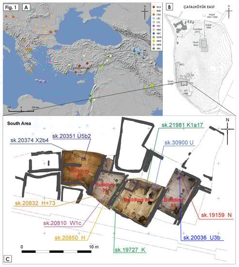 - Tylor, J. Excavations in the South Area. In Çatalhöyük 2012 Archive Report; Tung, B., Ed.; Çatalhöyük Research Project: Çatalhöyük, Turkey, 2012; pp. 35–61. [Google Scholar]