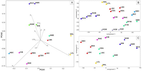 With the outliers excluded, the Neolithic Central Anatolian (NCA) population is always shown to be closely related to the Neolithic Population from the Marmara region (NMR) belonging to the same cluster in both PCA (Figure 2A) and t-SNE (Figure 2B,C) based analyses. The two form their own cluster in the PCA plot of the two first variables, describing 52.07% of variance and shown combined with the k-means clustering (with the k value of 7 as the best representation of the data, with the average silhouette of 0.3141) (Figure 2A) are far apart from Levantine populations, both Neolithic (NNL) and Chalcolithic (LCL). Other k-means variants (from 2 to 8) can be found in Supplementary Figure S4.