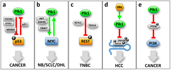 Proposed oncogenic mechanisms for Plk1. (a) The Plk1-p53 negative feedback loop. Plk1 leads to p53 destabilization, directly by phosphorylation of p53 or MDM2, or indirectly mediated by Topors and/or GTSE1. Transcriptionally, p53 is able to repress Plk1 expression directly binding to its promoter region. (b) The Plk1-MYC positive feedback loop. Plk1 can stabilize and increase the levels of the oncogenic transcription factor MYC, directly inhibiting the SCFFbw7 ubiquitin ligase complex, or by activation of the AKT-GSK3β kinase circuit. These mechanisms have been described for neuroblastoma (NB), small cell lung carcinoma (SCLC) and double hit lymphoma (DHL). (c) Plk1 overexpression leads to degradation of the tumor suppressor REST in triple negative breast cancer (TNBC). (d) Plk1 activation by the hepatitis B virus HBx factor leads to degradation of the transcription repression factors SUZ12 and ZNF198, both associated with the lncRNA HOTAIR in hepatocellular carcinoma. (e) Plk1 can activate the oncogenic PI3K pathway by inhibiting the PTEN tumor suppressor phosphatase. This leads to an increased cell proliferation rate and an elevated Warburg effect.