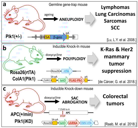 Plk1 genetic mouse models with tumor suppressor properties. (a) A germline heterozygous Plk1 mouse (Plk1+/−), generated by gene-trapping the exon 9 of the murine Plk1 gene, develops mainly lymphomas in the long latency, due to aneuploidy. (b) Inducible Plk1 knock-in (Plk1-KI), generated by inserting the human Plk1 cDNA down-stream of the tetO sequences in the endogenous ColA1 locus, and later combined with the Rosa26-rtTA transactivator. Plk1 overexpression leads to polyploidy and this stops mammary tumor generation by the Ras and her2 oncogenes. (c) Plk1 inducible know-down mouse (Plk1-KD) is generated by inserting an shRNA under the tetO promoter u the Rosa26 locus. When combined with the colorectal model APCmin mice strain, downregulation of Plk1 leads to an increase in colorectal papillomas due to Spindle Assembly Checkpoint (SAC) abrogation and chromosome instability (CIN) induction. (Plk1 loss of function models are represented in red colored mice. The Plk1 gain of function model is represented by a green mouse).