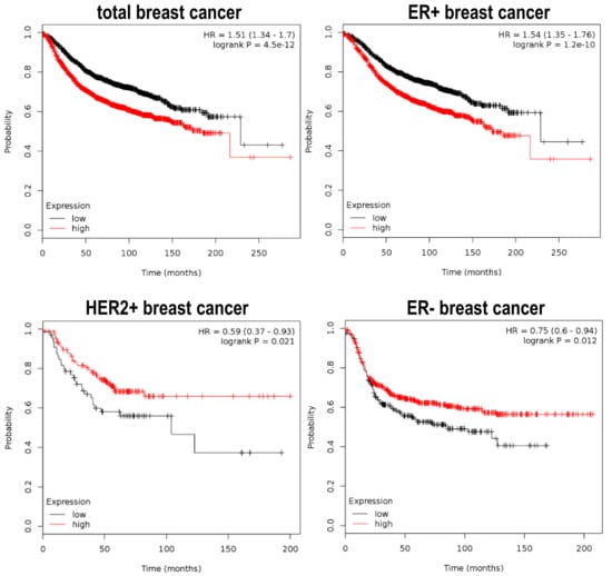 - Gyorffy, B.; Lanczky, A.; Eklund, A.C.; Denkert, C.; Budczies, J.; Li, Q.; Szallasi, Z. An online survival analysis tool to rapidly assess the effect of 22,277 genes on breast cancer prognosis using microarray data of 1809 patients. Breast Cancer Res. Treat. 2010, 123, 725–731. [Google Scholar] [CrossRef] [PubMed]