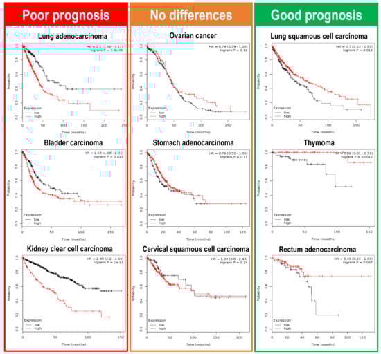 Can we get a wider picture of this Plk1 dichotomy in a pan-cancer analysis? Again, we can make use of the Kaplan Meier plotter initiative (www.kmplot.com) [68], testing how Plk1 expression correlates with overall survival (OS) in a large collection of different cancer types. The most recent information implemented by the Kaplan Meier plotter initiative uses mRNA quantitative sequencing data in a collection of twenty different cancer types (Breast cancer, Cervical squamous cell carcinoma, Esophageal carcinoma, Head-neck squamous cell carcinoma, Kidney renal clear cell carcinoma, Kidney renal papillary cell carcinoma, Liver hepatocellular carcinoma, Lung adenocarcinoma, Lung squamous cell carcinoma, Ovarian cancer, Pancreatic ductal adenocarcinoma, Pheochromocytoma and Paraganglioma, Rectum adenocarcinoma, Sarcoma, Stomach adenocarcinoma, Testicular Germ Cell Tumor, Thymoma, Thyroid carcinoma, and Uterine corpus endometrial carcinoma). Correlation analysis of Plk1 expression with patient overall survival demonstrates that Plk1 overexpression leads to different outcomes depending on the tumor type (Figure 4). Plk1 expression leads to poor prognosis in lung, bladder, and kidney clear cell carcinomas patients, whereas in patients suffering from thymoma, lung squamous cell carcinoma or rectum adenocarcinoma, Plk1 higher levels seem to indicate a much better prognosis. There is also a group of tumors where Plk1 levels do not alter the patient prognosis (ovarian cancer, stomach carcinoma, and cervical squamous carcinoma). These data reveal that Plk1 expression levels can either specify poor or good prognosis to patients, hence showing that Plk1 can play as a tumor aggressiveness accelerator or as a tumor stopper in a wide variety of different tumors.