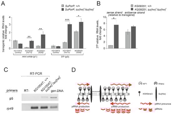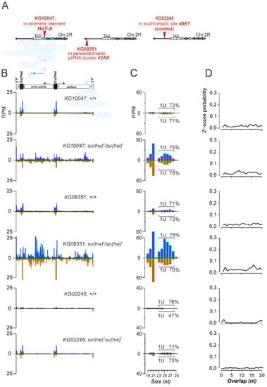 3.1. P{SUPor-P} Transgenic Constructs Inserted into piRNA Clusters Do Not Produce piRNAs