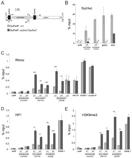 ChIP was performed according to the published procedure [7]. Chromatin was immunoprecipitated with the following antibodies: anti-HP1a (C1A9 Developmental Studies Hybridoma Bank, Iowa Sity, IA, USA), anti-trimethyl-histone H3 Lys9 (Millipore, Burlington, MA, USA), Rhi antiserum [29] and anti-Su(Hw) [30]. Primers used in the study are listed in Table S1. Quantitative PCR was conducted with a LightCycler 96 (Roche, Basel, Switzerland). Obtained values were normalized to input and compared with values at rp49 gene as a control genomic region. Standard error of mean (SEM) of triplicate PCR measurements for three biological replicates was calculated.