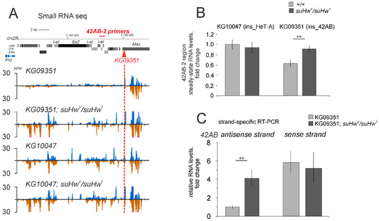Given the functional integrity of piRNA clusters, we suggested that gypsy insulators might impair the functioning of the cluster regions in the close vicinity of transgenic insertion. To verify this suggestion, we estimated piRNA production in 42AB regions located around the KG09351 insertion.