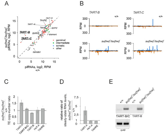 However, piRNA production from few TEs was strongly affected (Table S2). In particular, Su(Hw) mutations caused a 100-fold increase in the abundance of piRNAs specific to TART-B and TART-C subfamilies of telomeric retrotransposons (Figure 5B, Table S2). To exclude the influence of copy number polymorphism, we evaluated the relative copy number of telomeric retrotransposons in KG10047;+/+ and KG10047;su(Hw)V/su(Hw)f strains. To this end, we performed PCR on genomic DNA and showed that the relative copy numbers of HeT-A, TAHRE, TART-A, TART-B and TART-C are very similar in both strains (Figure 5C). These data strongly suggest that TART-B/TART-C transcripts are protected by Su(Hw)-dependent border elements from the piRNA production. Next, we examined the RNA levels of telomeric retroelements in the ovaries of Su(Hw) mutants by RT-qPCR. We found an increased level of TART-A transcripts in the ovaries of Su(Hw) mutants, while HeT-A and TAHRE expression was not affected (Figure 5D). However, the levels of TART-B and TART-C transcripts in the wild type ovaries were undetectable by RT-qPCR. Probably, TART expression is limited by a time window during oogenesis, resulting in low levels of TART RNA in the total ovarian RNA. Then, we performed semiquantitative RT-PCR and observed that TART-B and TART-C transcripts were barely revealed in the wild type ovaries but readily detected in the ovaries of Su(Hw) mutants (Figure 5E). These data suggest that Su(Hw)-dependent insulators provide appropriate levels of TART-encoding transcripts in telomeres. Su(Hw) serves as a transcriptional repressor of coding genes in the ovary [26]. Notably, in wild-type ovaries, TART transcripts are less abundant than upon Su(Hw) depletion. Thus, Su(Hw) likely mediates transcriptional repression of TART in the germline.