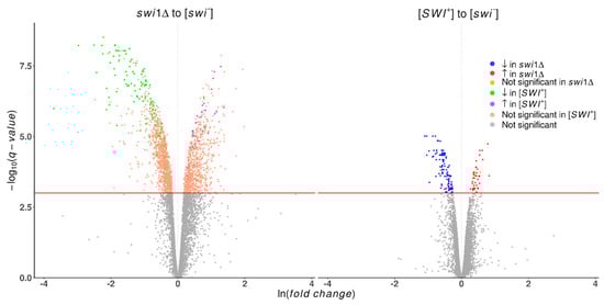 Volcano plots demonstrating differentially expressed genes in the swi1Δ and [SWI+] compared with [swi−] strains. Plotted on the x-axis is the ln fold difference between [swi−] and the corresponding strain. Plotted on the y-axis is the −log10(q-value) calculated with R package Sleuth []. Genes whose expression changes are nonsignificant are shown in gray below the red line, while significant differentially expressed genes (FDR < 0.001) are divided into categories, as follows. On the plot comparing swi1Δ to [swi−], green indicates genes significantly downregulated in [SWI+], purple represents genes significantly upregulated in [SWI+], and pink signifies genes which are nonsignificant in the comparison of [SWI+] to [swi−]. On the plot of [SWI+] to [swi−], genes downregulated in swi1Δ are shown blue, those upregulated in swi1Δ are red, and those which are nonsignificant in the comparison of swi1Δ to [swi−] are yellow.
